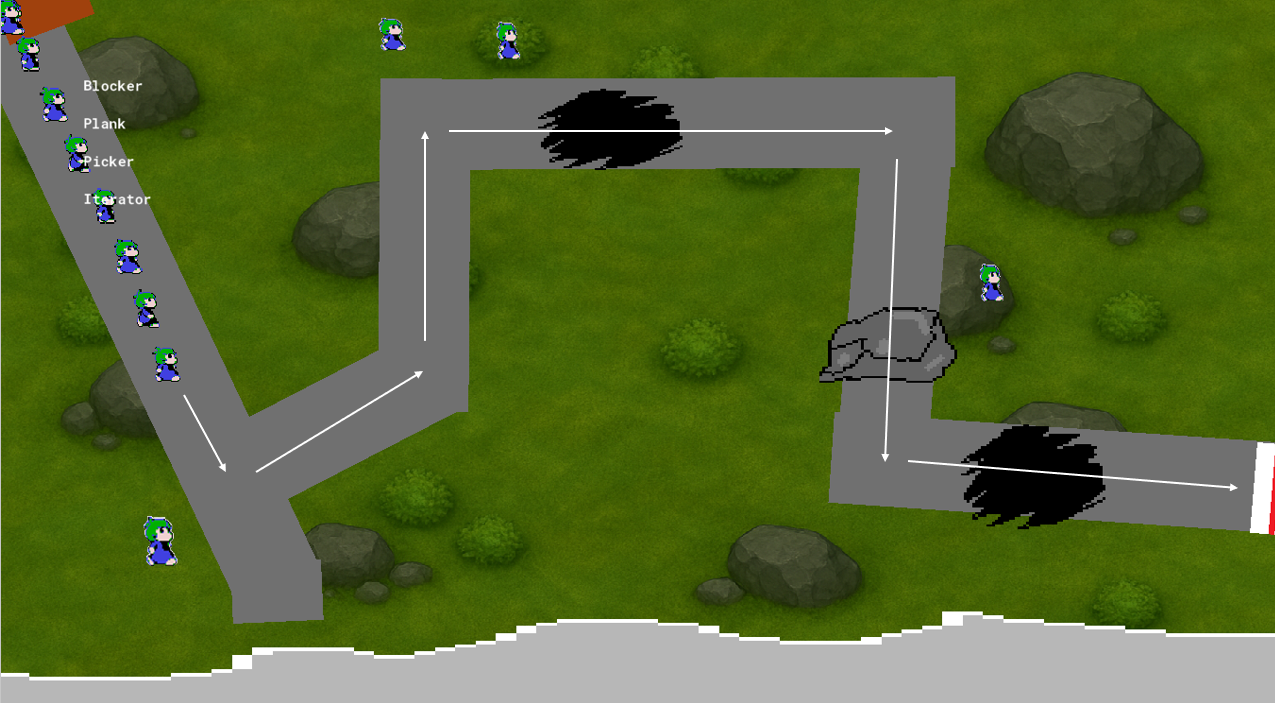 Plank: This lemming has planks by which it can construct a bridge. This is used to safely cross the pitfalls. This is represented in the game with a lemming holding the plank